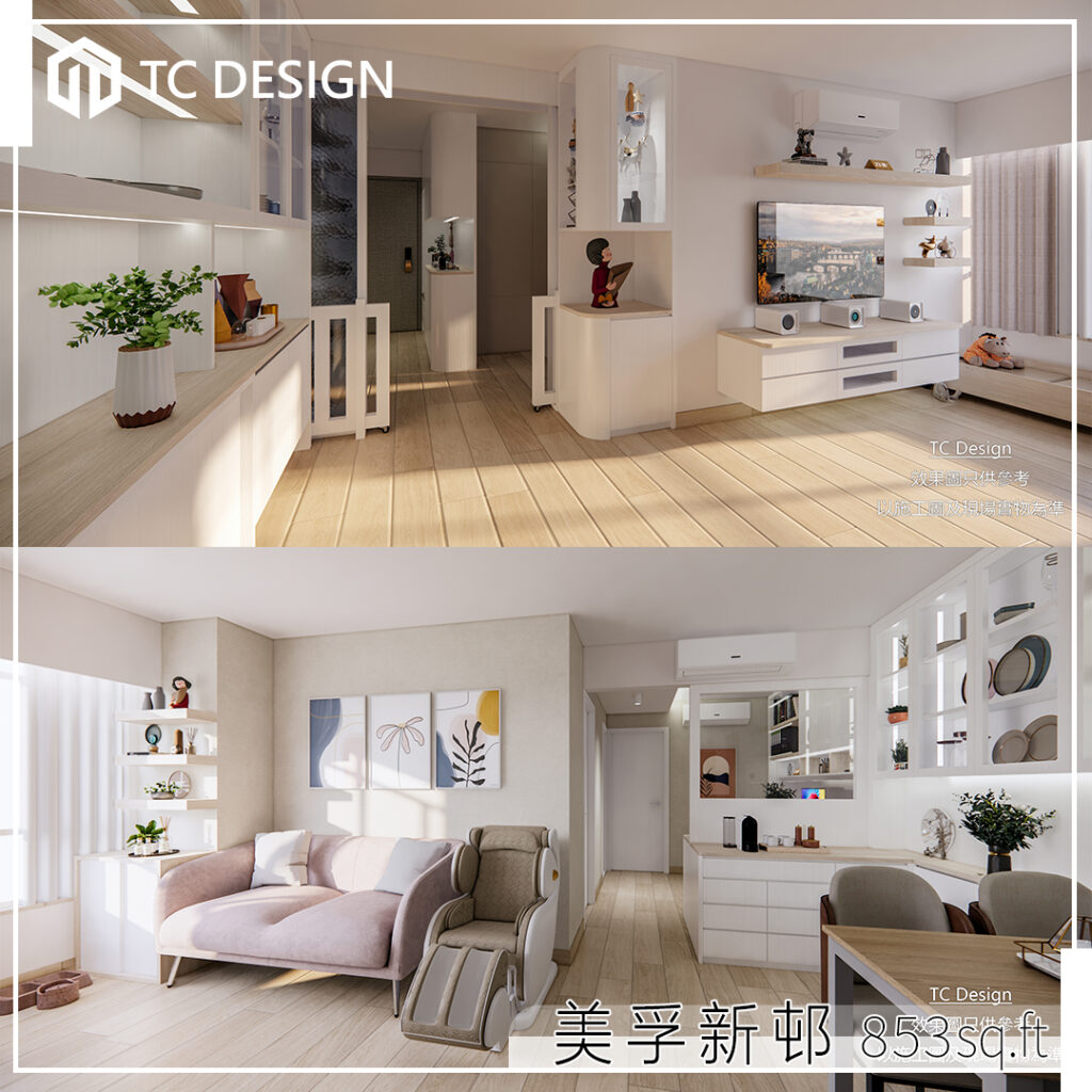 在這個853 平方呎的空間中,TC Design 精準掌握現代人對居家質感的渴望,打造出一個兼具實用與美學的理想生活場域。整體空間以淡木色地板與米白色牆面為主軸,輔以柔和的自然光線,使空間呈現出溫潤且寧靜的氛圍,讓人一踏進門,便能感受到一股撫慰人心的安定感。